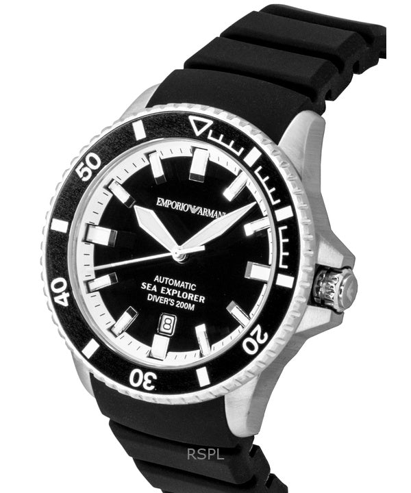 Reloj de buceo automático Emporio Armani Sea Explorer AR60086 con correa de silicona y esfera negra para hombre, 200 m