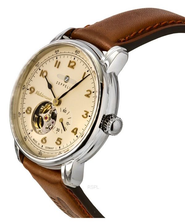 Reloj Zeppelin Mediterranee con correa de cuero y corazón abierto, esfera beige, automático 96665 para hombre